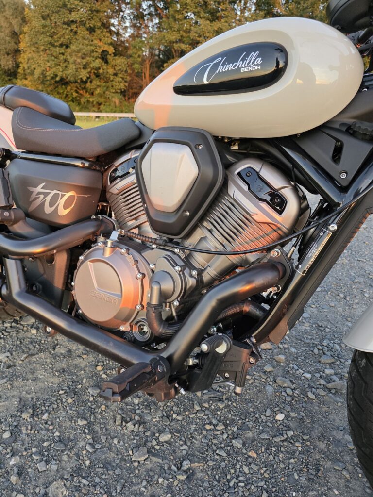 A tu prichádza dôležitá pravda, ktorú treba povedať nahlas: Chinchilla 500 nie je športovec. V-twin s objemom 475,6 cc a DOHC rozvodom vyprodukuje 47 k pri 9 000 ot./min a 42 Nm — čísla, ktoré postačujú na plynulú mestskú jazdu, pohodovú krajinu a občasnú diaľnicu. Ale ak hľadáte ten točivý výstrel z nízkych otáčok alebo vzrušenie pri otáčaní rukoväte, Chinchilla vám ho nedá.