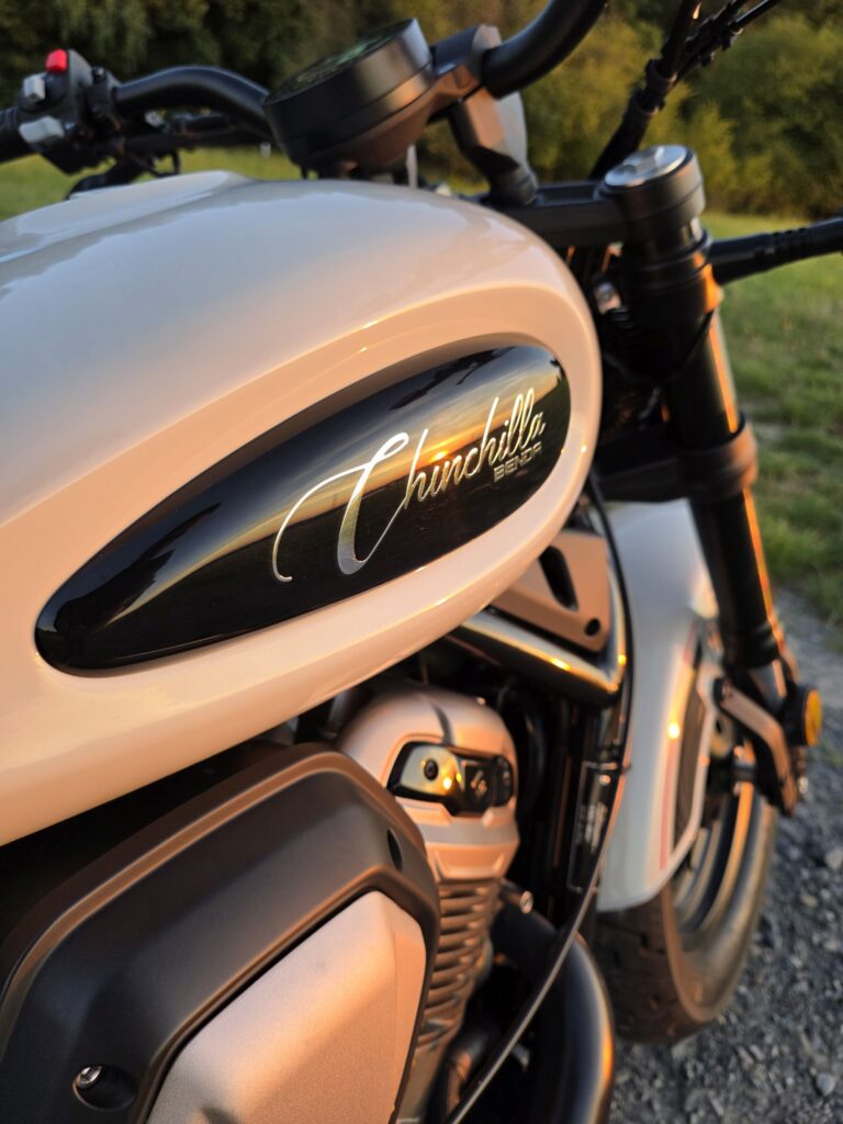 Keď vbehniete do kanála alebo zachytíte výtlk, Chinchilla pohltí ránu bez toho, aby vás kopla do krížov. Zdvih 130 mm vpredu a 66 mm vzadu pracujú kultivovane, s dlhým, kontrolovaným priebehom, ktorý nesie komfort pred tvrdosťou. A predsa — na plynulej ceste sa motorka správa čulo, bez kývania a bez pocitu, že sedíte na váľaní. Je to ten vzácny kompromis, ktorý lacnejšie motorky väčšinou nenájdu. Chinchille sa to podarilo.