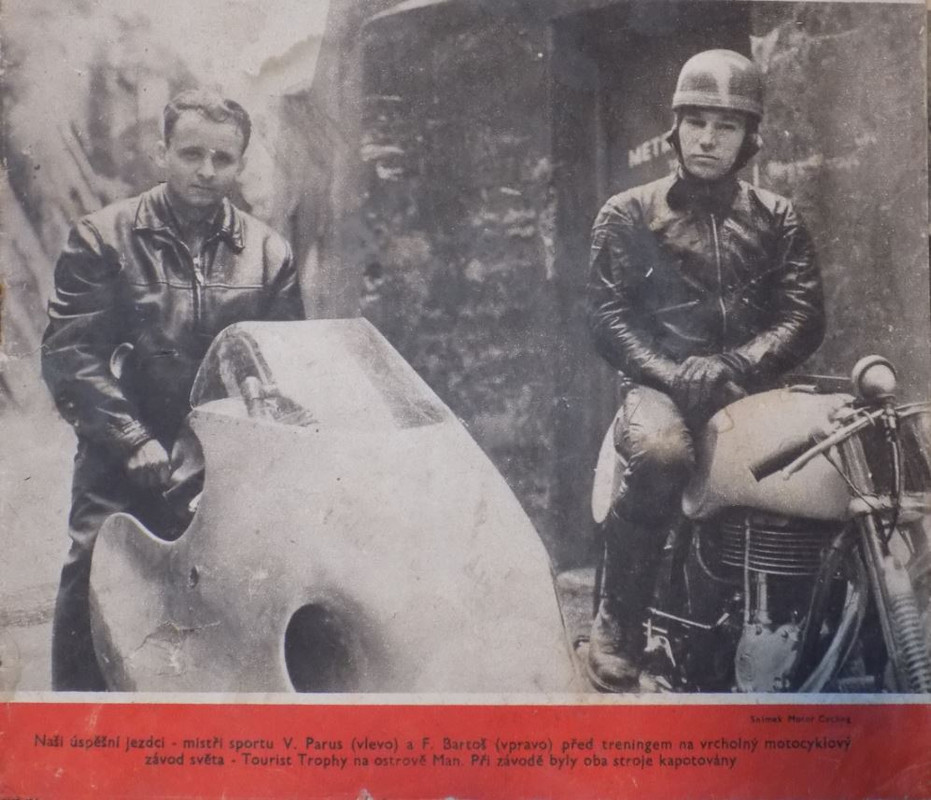 Mladučký Parous a Bartoš sú tam napr. zachytení na štarte TT v roku 1956, alebo Havel a Štajner na štarte v Mělníku v roku 1954.Niečo také „ideologické“, že na motocykloch do socializmu nedostaneme, odznelo až neskôr, keď už súdruhov vozili na šesťstotrojkách a eMBéčkam sa prestávali odlamovať zadné kolesá aj s nábojmi…