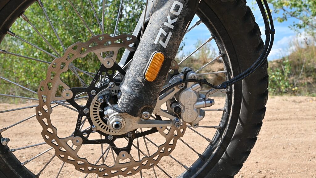 Brzdy Taisko – predný 310 mm s dvojpiestikom, zadný 240 mm s jedným – poskytujú kontrolu aj v najtvrdejších zjazdoch. Najlepšie na tom je prepínateľné ABS: ON / len predné / úplne OFF, a pamätá si posledné nastavenie .
