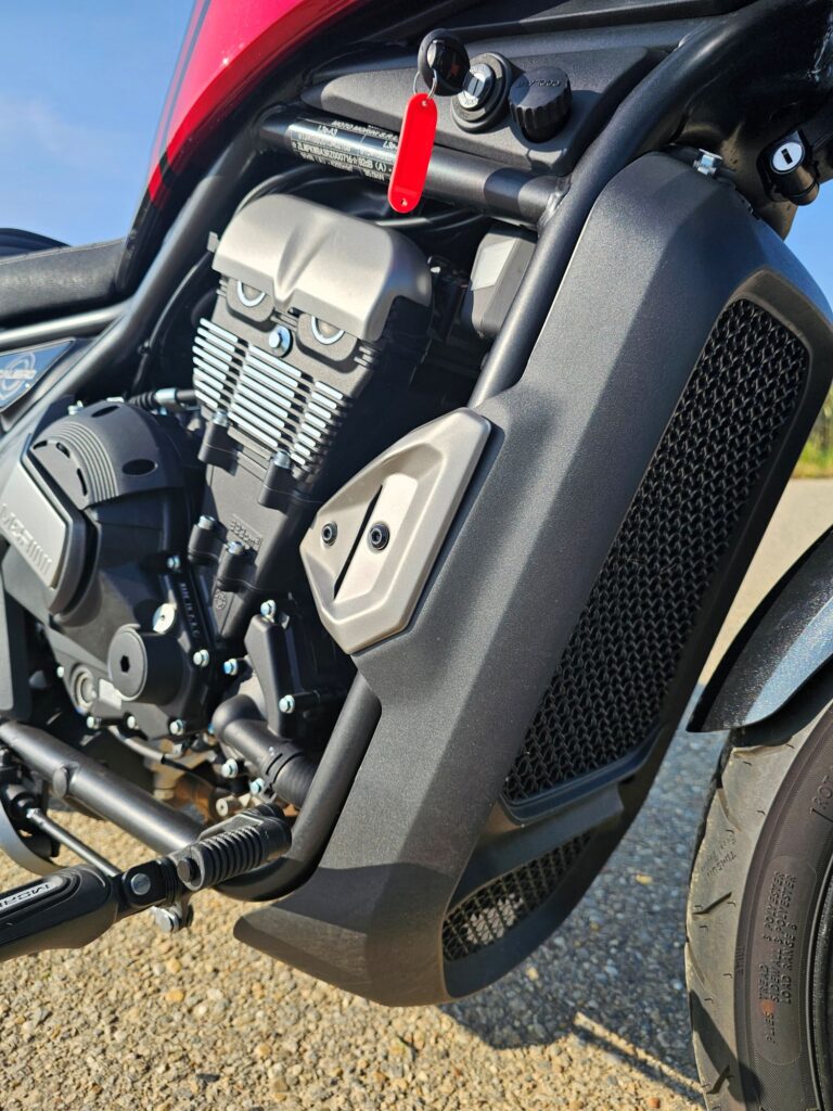 Paralelný dvojvalec so zdvihovým objemom 693 cm³ má štyri ventily na valec, DOHC a kvapalinové chladenie. Výkon je okolo 69 koní pri 8 500 ot./min a krútiaci moment 68 Nm pri 6 500 ot./min. Motor je kultivovaný, ťahá odspodu a v strednom pásme pôsobí živšie, než by sa čakalo. Vibrácie sú prítomné, ale nie rušivé – skôr dotvárajú charakter.
