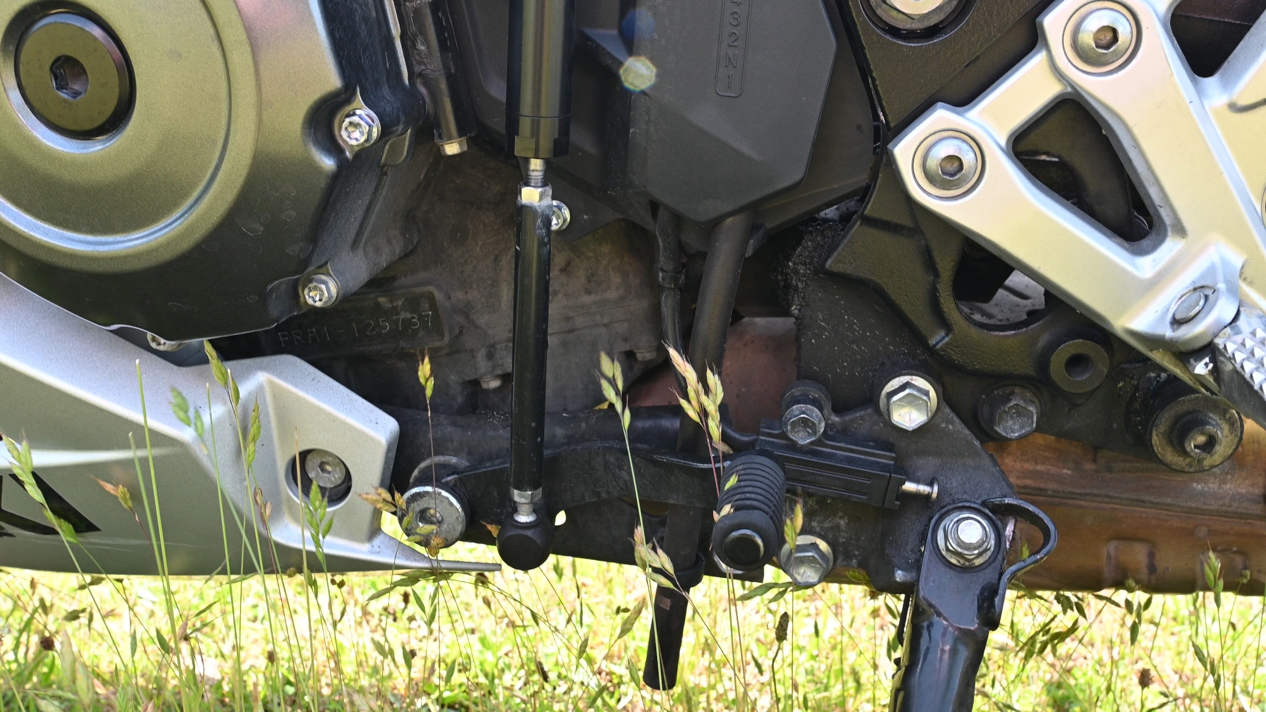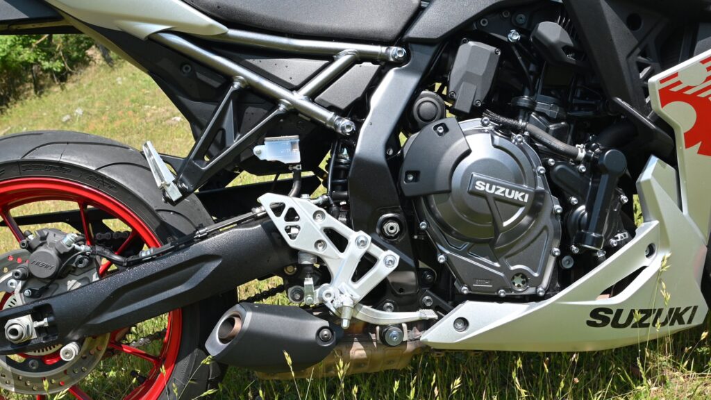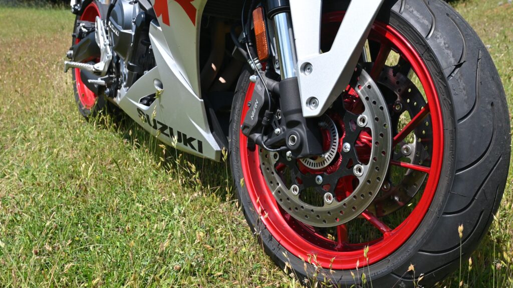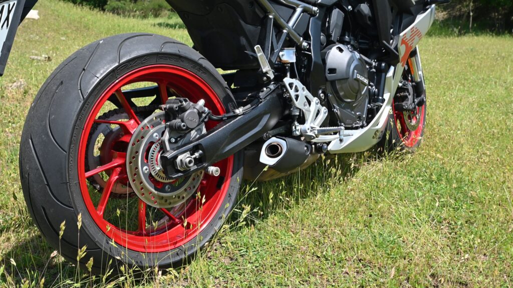 Vpredu USD 41 mm (SFF-BP), vzadu priamy tlmič s pákovaním. Žiadne „semiaktívno“, ale nastavenie dáva zmysel hneď po vyjazdení: predok drží pri brzdení, v strednom tempe krásne číta asfalt. Zadok nie je drevo; zvládne nerovnosť aj v náklone bez odskoku. Na sériových gumách vieš ísť prekvapivo rýchlo a stále „čisto“. Ak pritvrdíš predpätie a odskok vzadu, zvládne aj svižný track day.
