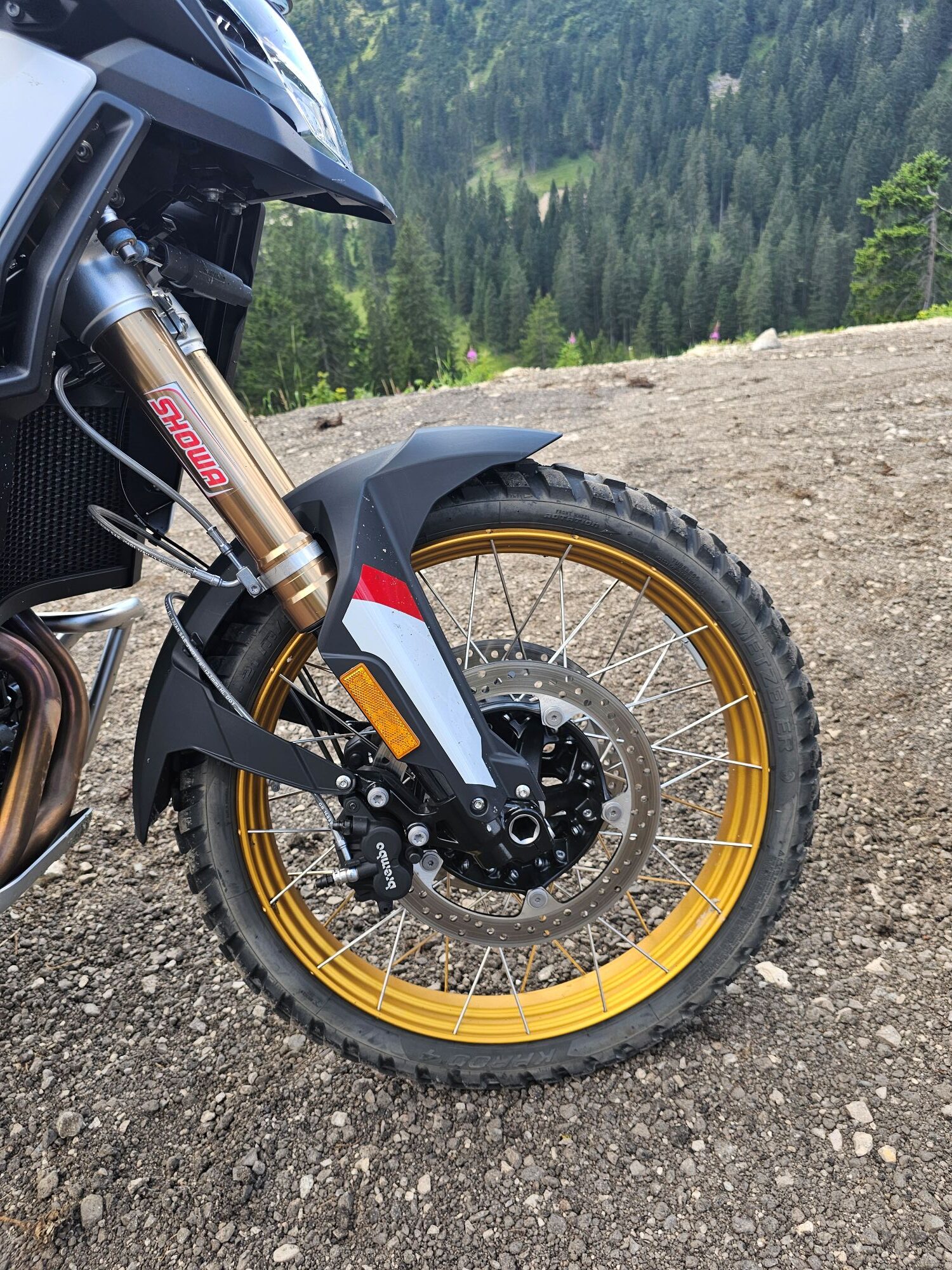 My sme však mali vďaka športovému podvozku s 45mm, plne nastaviteľnú vidlicu Showa vo voliteľnom balíčku Enduro Pro. Tento podvozok je rovnako príplatkový, rozhodne však prináša obrovské benefity v teréne. Brzdy sú rovnaké ako pri F800GS, ale nižšia hmotnosť F900GS (219 kg oproti 227 kg) zabezpečuje lepšiu ovládateľnosť v zákrutách a pri prudkých manévroch.