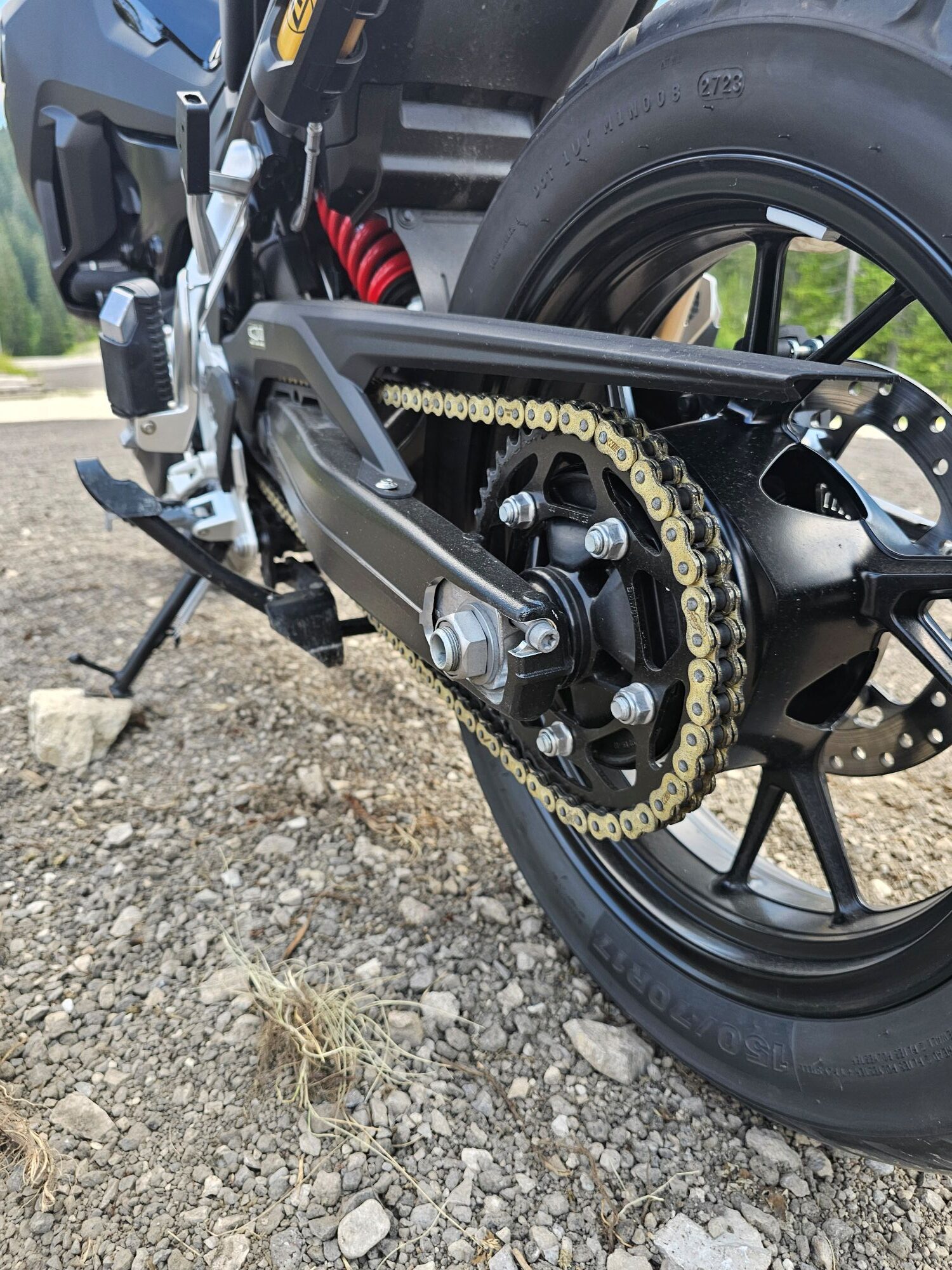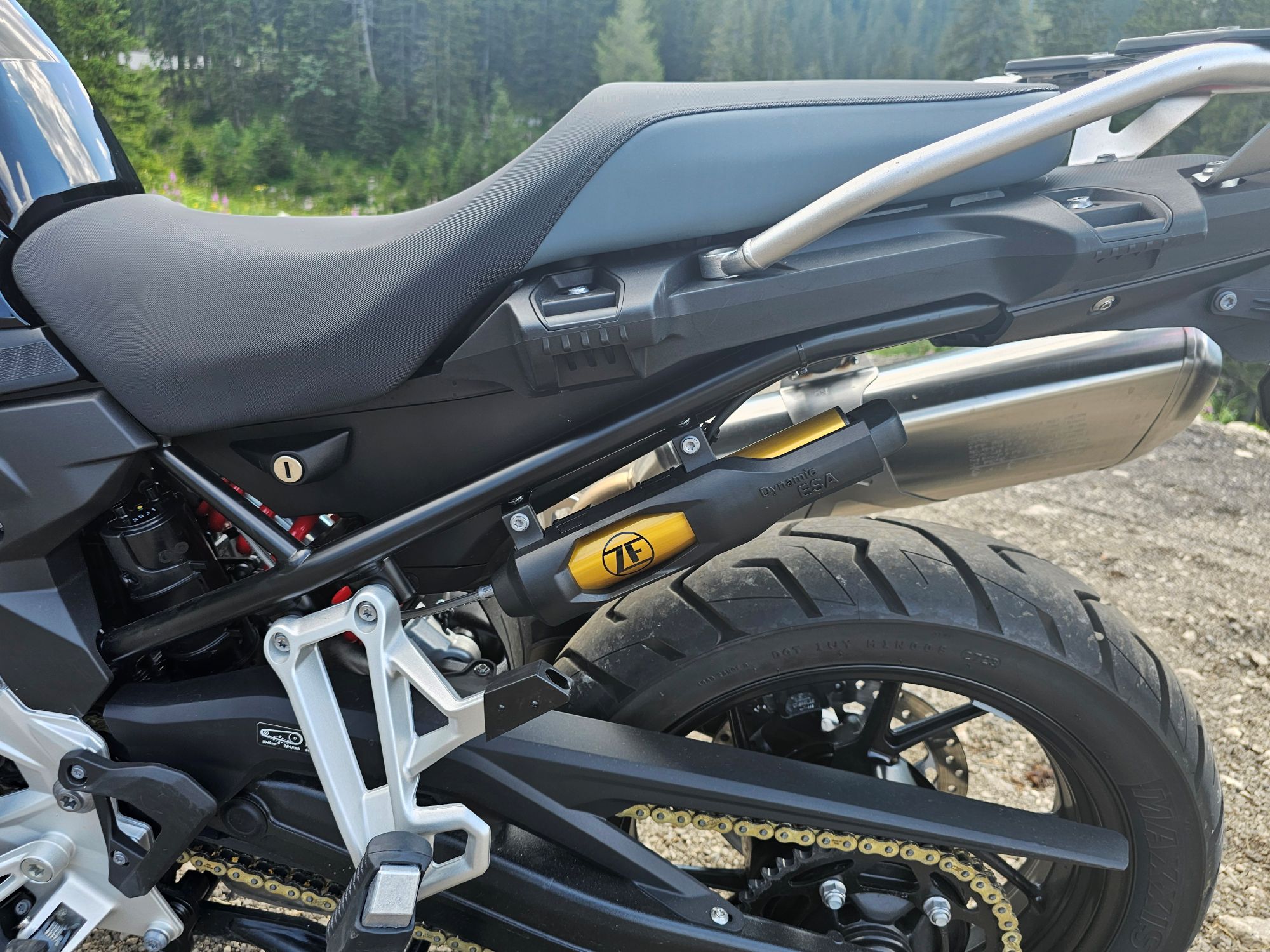 F900GS prichádza štandardne s 43 mm obrátenou teleskopickou vidlicou, ktorá ponúka lepšiu odozvu a nastaviteľné tlmenie. Jeho zdvih odpruženia je väčší – 230 mm vpredu a 215 mm vzadu – čo znamená lepší komfort pri prejazde nerovnosťami.