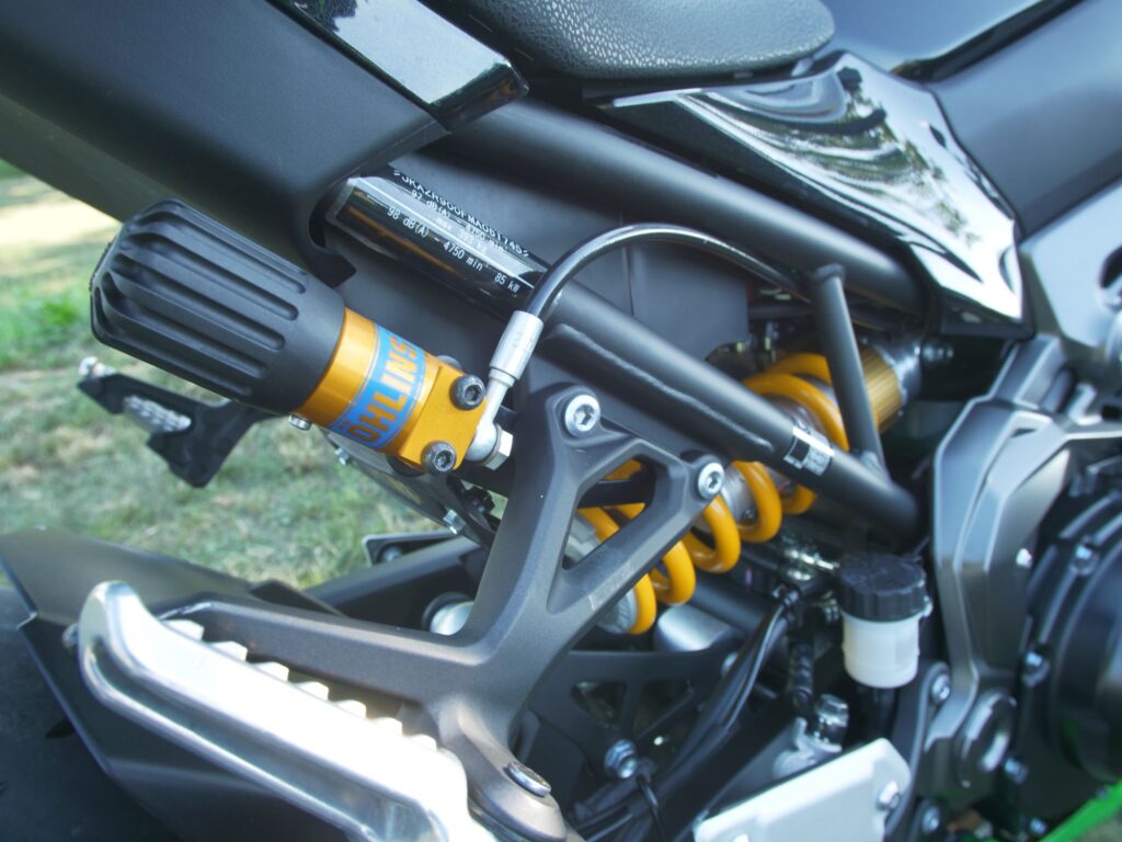 Z900 SE však prináša výrazné vylepšenia. Predná vidlica síce zostáva rovnaká, ale dostáva kvalitnejšie vnútorné komponenty od značky Showa, čo zlepšuje odozvu a stabilitu. Najväčším prínosom je však nový zadný tlmič Öhlins S46, ktorý poskytuje lepšie tlmenie a vyšší komfort pri jazde po nerovnostiach. Okrem toho, Z900 SE prichádza s Brembo M4.32 monoblokovými strmeňmi a oceľovými brzdovými hadicami, čo výrazne zvyšuje brzdný výkon oproti základnému modelu.