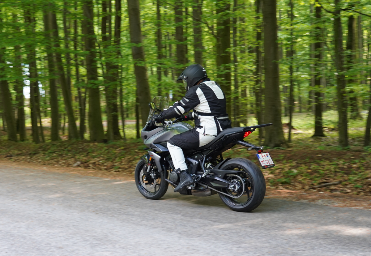 Hmotnosť tesne nad 200 kg je ešte celkom akceptovateľná aj pre neskúsených, aj keď úprimne, existujú aj omnoho ľahšie stroje v tejto kubatúre, napríklad skvelá Aprila Tuareg 660. Ak ale chceš viac cestovať, toto bude lepšia voľba. Najmä ten trojvalec neprotestuje ani keď ho podtáčaš, skrátka vytiahne ťa zo suterénu až po 10 000 o/min. Tie mimochodom zo začiatku určite nebudeš hľadať, pretože to chce trocha odvahy. Predsa len výkon 80 k je už poznať pri tejto váhe a ako opatrnému jazdcovi ti bohate bude stačiť aj polovičné spektrum. Navyše predajca ti vie motorku prišrtiť aj na legálny limit 35 kW, takže dvere su otvorené aj menším vodičákom A2.