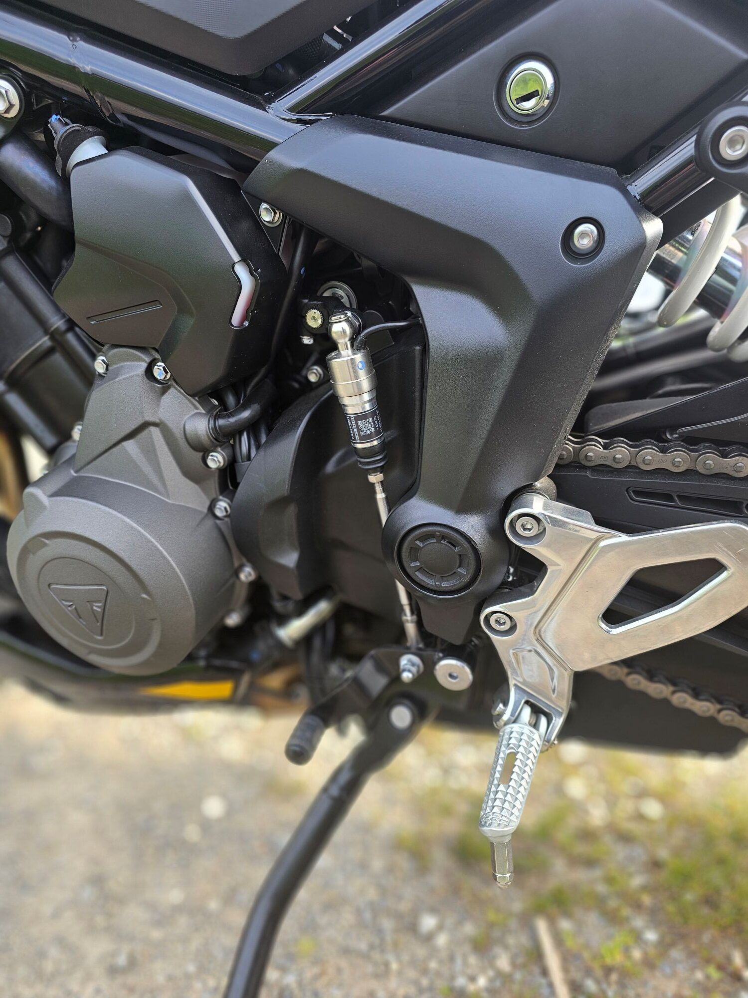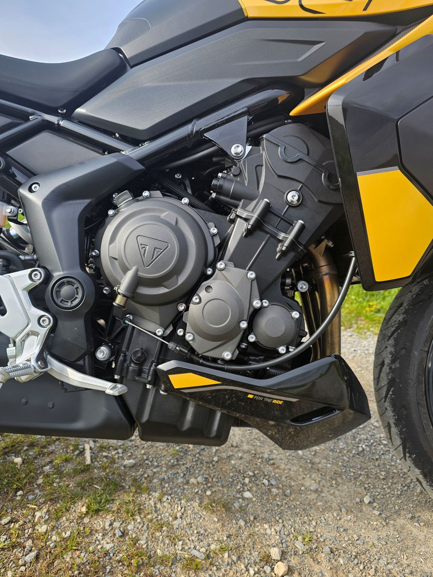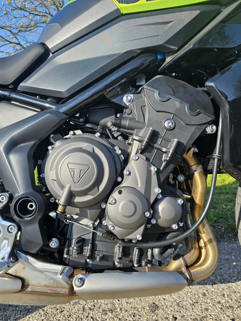 Nový trojvalec 798 cm³ je športovejšie naladený ako motor v Tigeri 900. Má kratší zdvih, ochotne točí a posúva výkon do vyšších otáčok. 115 koní pri 10 750 ot./min je citeľných najmä pri výjazdoch zo zákrut a na diaľnici. 84 Nm pri 8 500 ot./min zaručuje plynulý a silný ťah už od stredu otáčok. Quickshifter (v sérii) zjednodušuje radenie a podporuje športový štýl jazdy. Mororka má aj menšiu rozetu a s danými číslami ochotne ťahá za riaditka aj v nižších rýchlostiach na vyššom prevodovom stupni. Dynamika, charakter aj zvuk je doména tohto pohonného ústrojenstva. Konkurenčný motor CP3 od Yamahy má doslova brutálnejší nástup, čo nesedí každému zákazníkovi. Tento motor je oproti nemu väčší kluďas, ktorý ti stále spraví husiu kožu na chrbte.