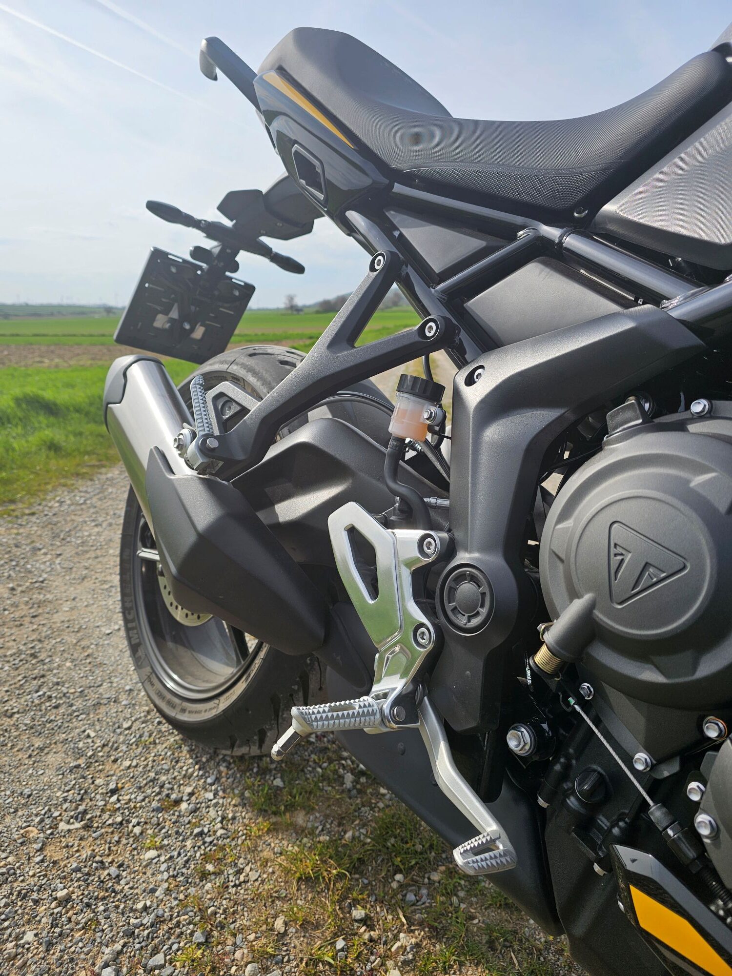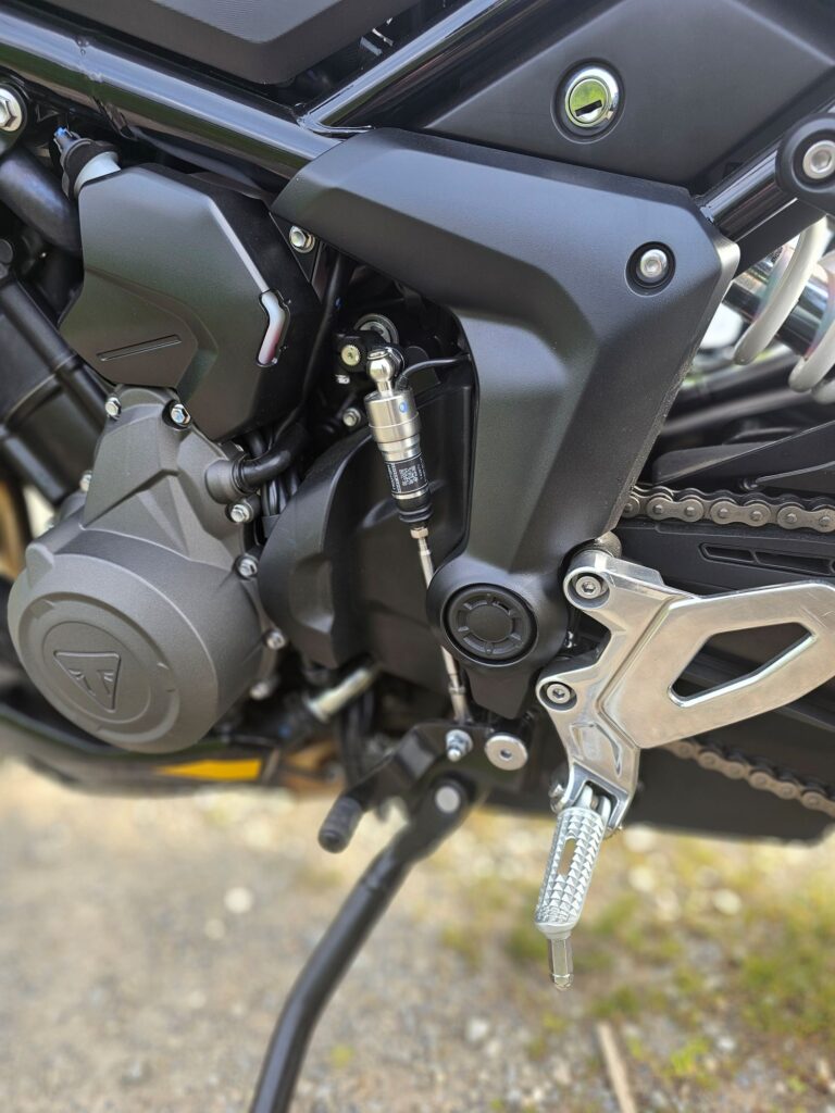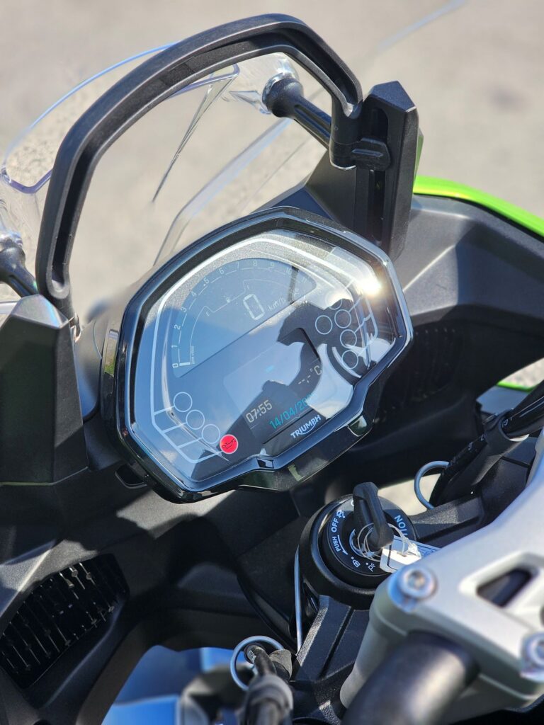 Základná výbava zahŕňa náklonové ABS, kontrolu trakcie (vypínateľná), 3 jazdné režimy (Road, Rain a Sport), 2 dielny displej a Bluetooth konektivitu (voliteľná aplikácia My Triumph). Tempomat aj quickshifter tu nájdeš už v základe.