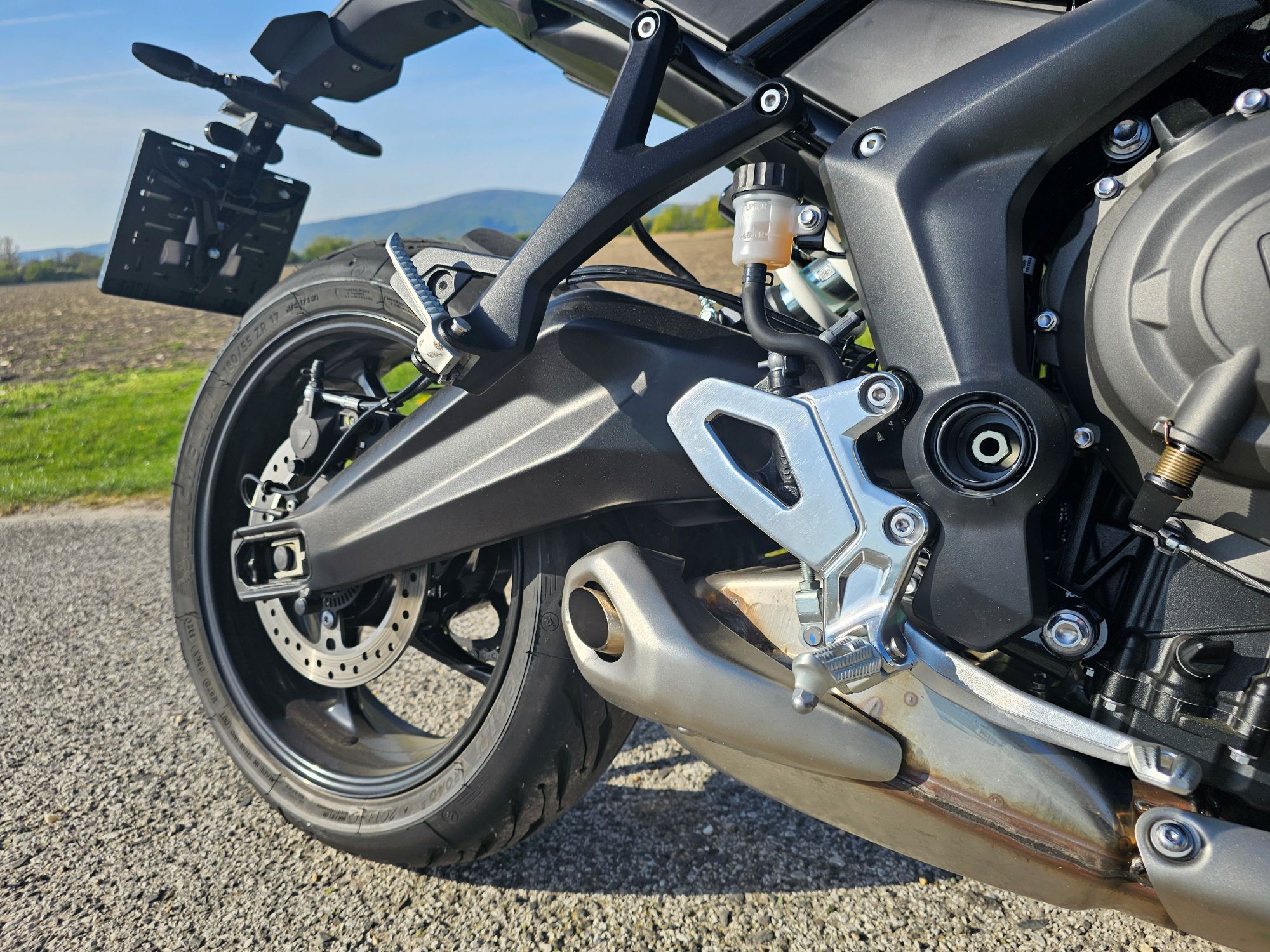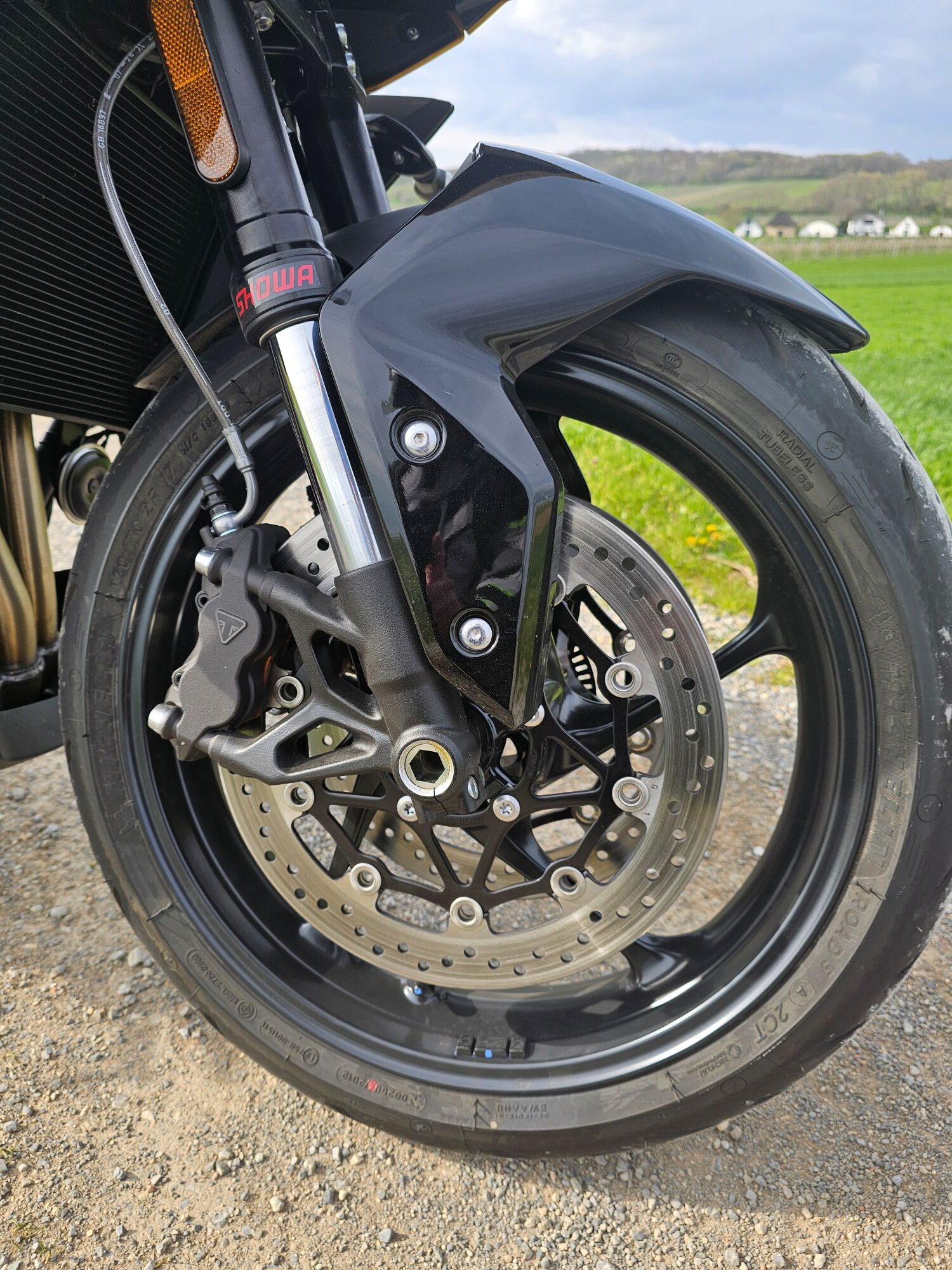 Predné 320 mm kotúče s radiálnymi štvorpiestikovými strmeňmi z továrne Triumph. Výrazný brzdný účinok, presný nástup, minimálny fading. Zadná brzda 255 mm. ABS je náklonové, pracuje plynulo a nenásilne. Brembá to teda nie su, ale kým sa nepozrieš na samotné strmene, ani o tom nebudeš vedieť.