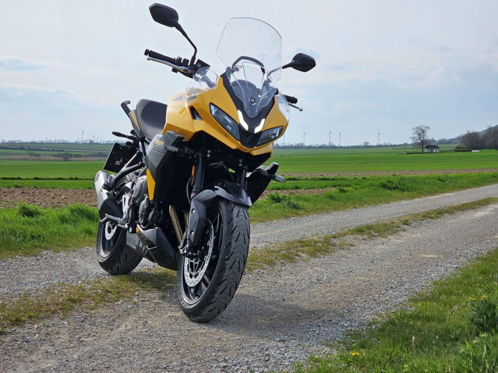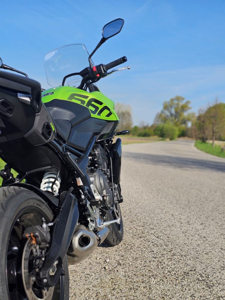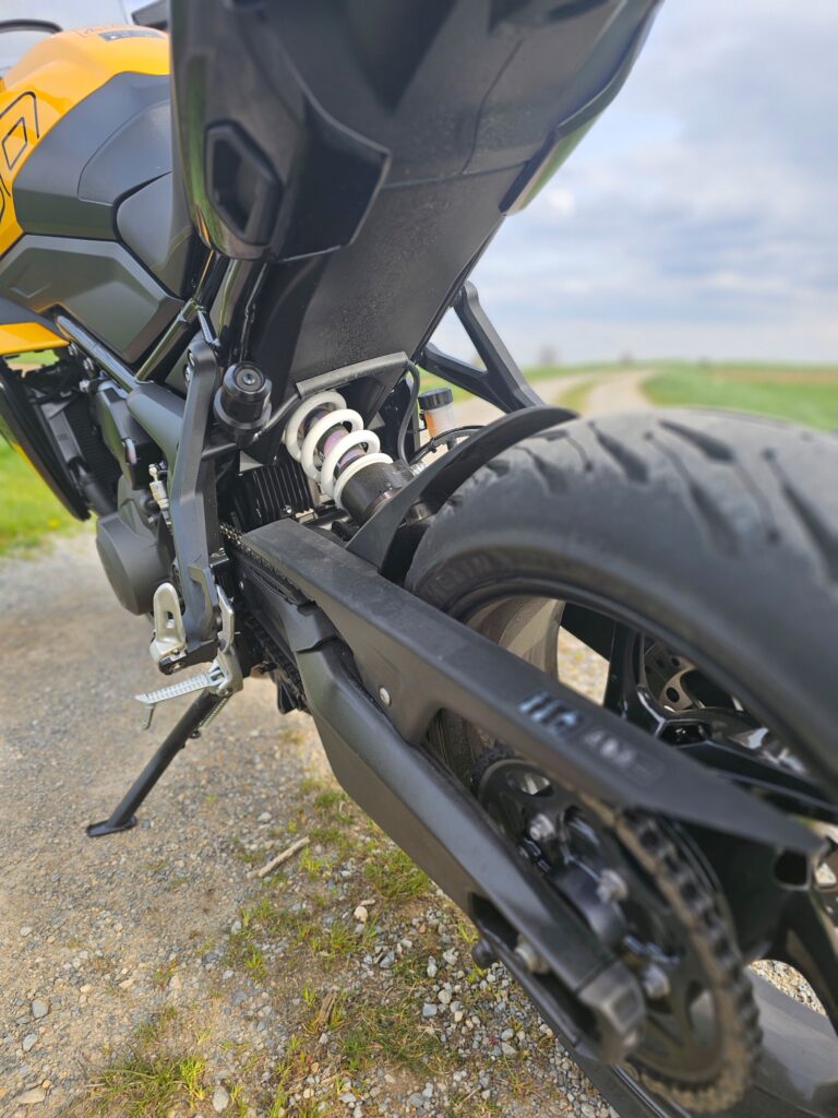 Vpredu pracuje 41 mm upside-down vidlica Showa, zdvih 150 mm. Zadný tlmič Showa má nastaviteľné predpätie. Komponenty nie sú nastaviteľné, ale fungujú spoľahlivo – mäkšie naladenie sa hodí do našich ciest. Motorka je stabilná, hravo zvláda zákruty. Oceníš ho klavne na rozbitých slovenských cestách. K tomu patrí adekvátne ponáranie, ale nezľakne sa ani športovejšej jazdy.