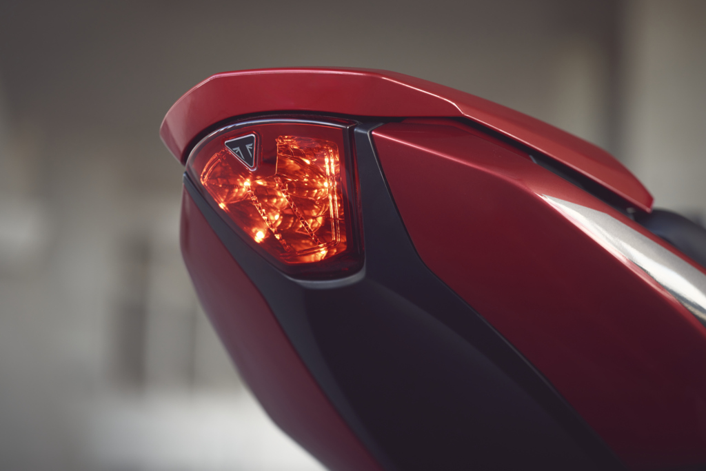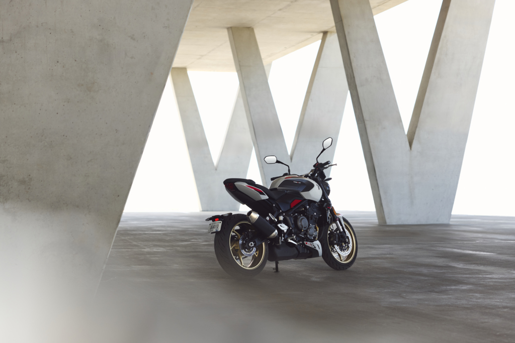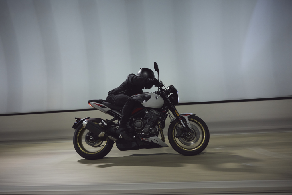 Dizajn kombinuje moderné línie so športovými proporciami. Krátka zadná časť, kompaktný 14-litrový tank a podrezaný výfuk vytvárajú mestský, agresívny postoj. Prémiové detaily, prešívané sedlo s logom Trident a zlaté kolesá sú dôkazom, že Triumph v tejto kategórii nešetril na detailoch. K dispozícii budú tri farebné kombinácie a široká paleta doplnkov vrátane voliteľného titánového výfuku Akrapovič.