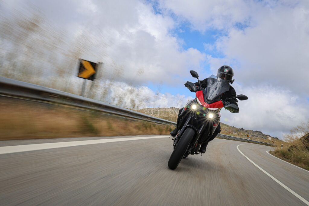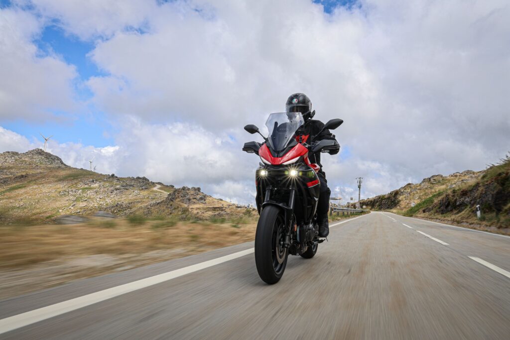 Nový ride-by-wire plyn je veľké plus. Reakcia motora na plyn je plynulá, ale zároveň rýchla. Ak si dáš Sport, dostaneš okamžitý ťah. V režime Street je odozva jemnejšia, vhodná do mesta. Custom? Tu si vieš všetko nastaviť podľa seba – reakciu plynu, trakciu, dokonca aj intenzitu asistencie. Trakčná kontrola je nastaviteľná, dá sa úplne vypnúť. Pri razantnejšom otočení plynu sa motorka driapala na zadné. Motorka podržala, elektronika zasiahla, keď bolo treba. Tempomat je pohodlie na diaľnici, nastavíš si 130 a už len relaxuješ. TFT displej je parádne čitateľný, pod slnkom v Portugalsku nebol žiadny problém. Pripojenie na mobil? Skúšal som volať, zobraziť správy aj spustiť navigáciu – všetko prehľadne na displeji. Malú výtku mám k zobrazeniu navigácie – respektíve názov ulíc či čísel, ktoré sú malým fontom- USB-C pod riadidlami je už dnes nutnosť. Nabíjal som mobil za jazdy, bez problémov.